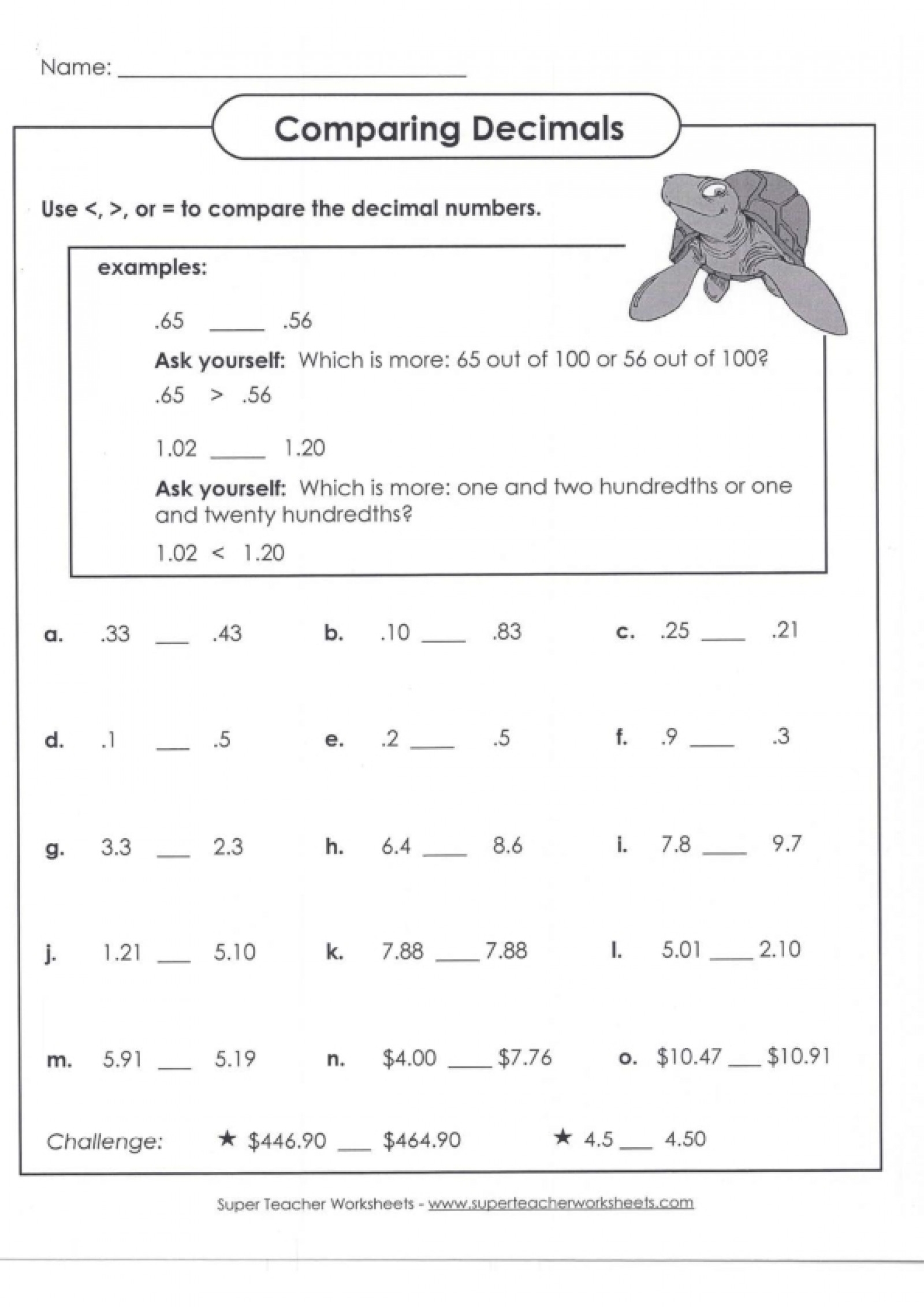 comparing decimals worksheet