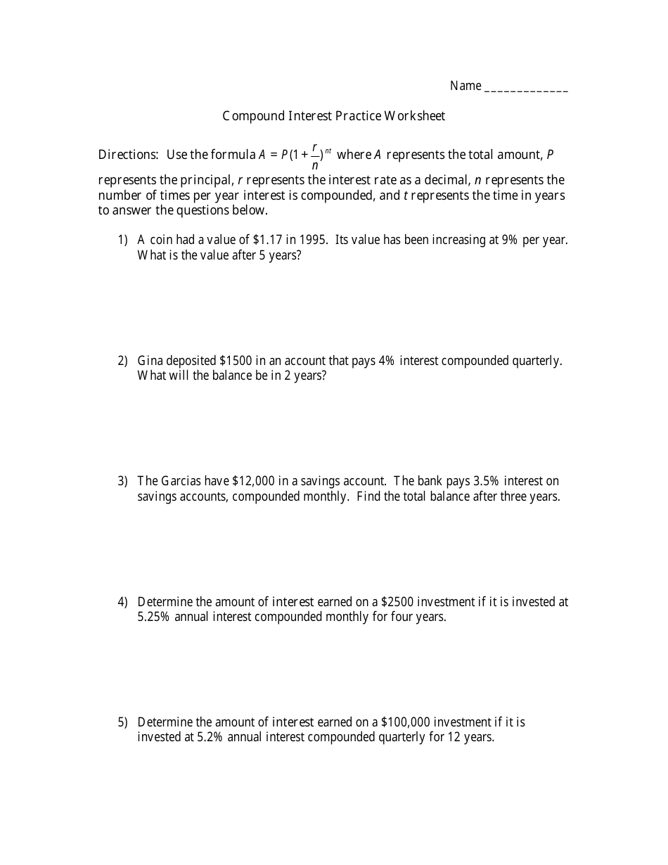 Compound Interest Worksheet Algebra I PDF Worksheets