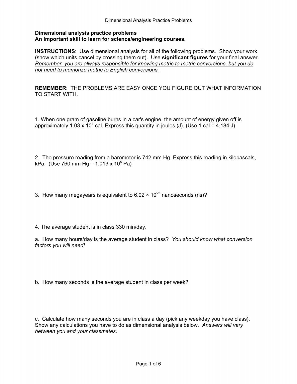 By working through a dimensional analysis worksheet, you can break down complex problems into simpler steps. This method allows you to convert units, solve for unknown variables, and ensure your calculations are accurate. With regular practice, you’ll build confidence in your abilities.