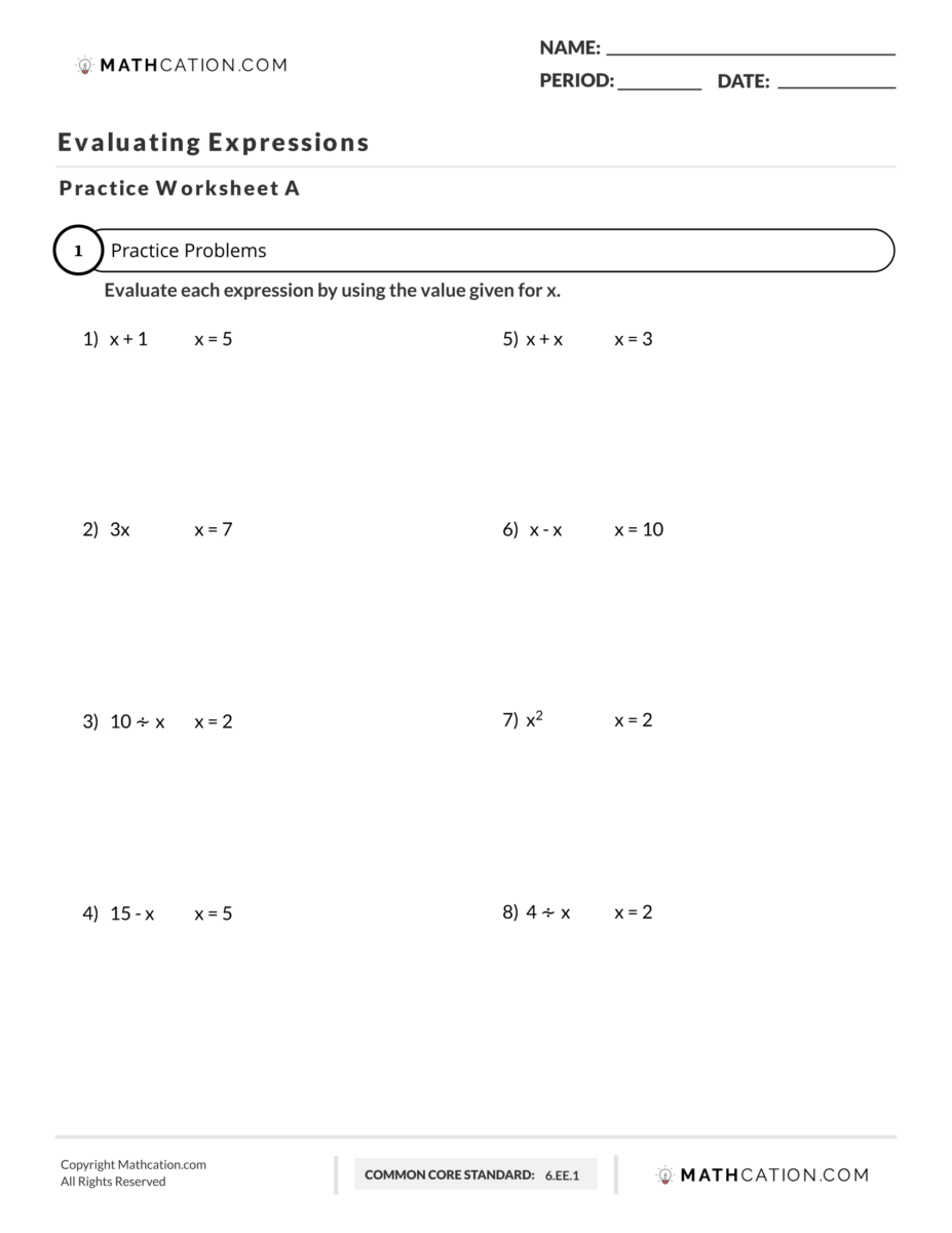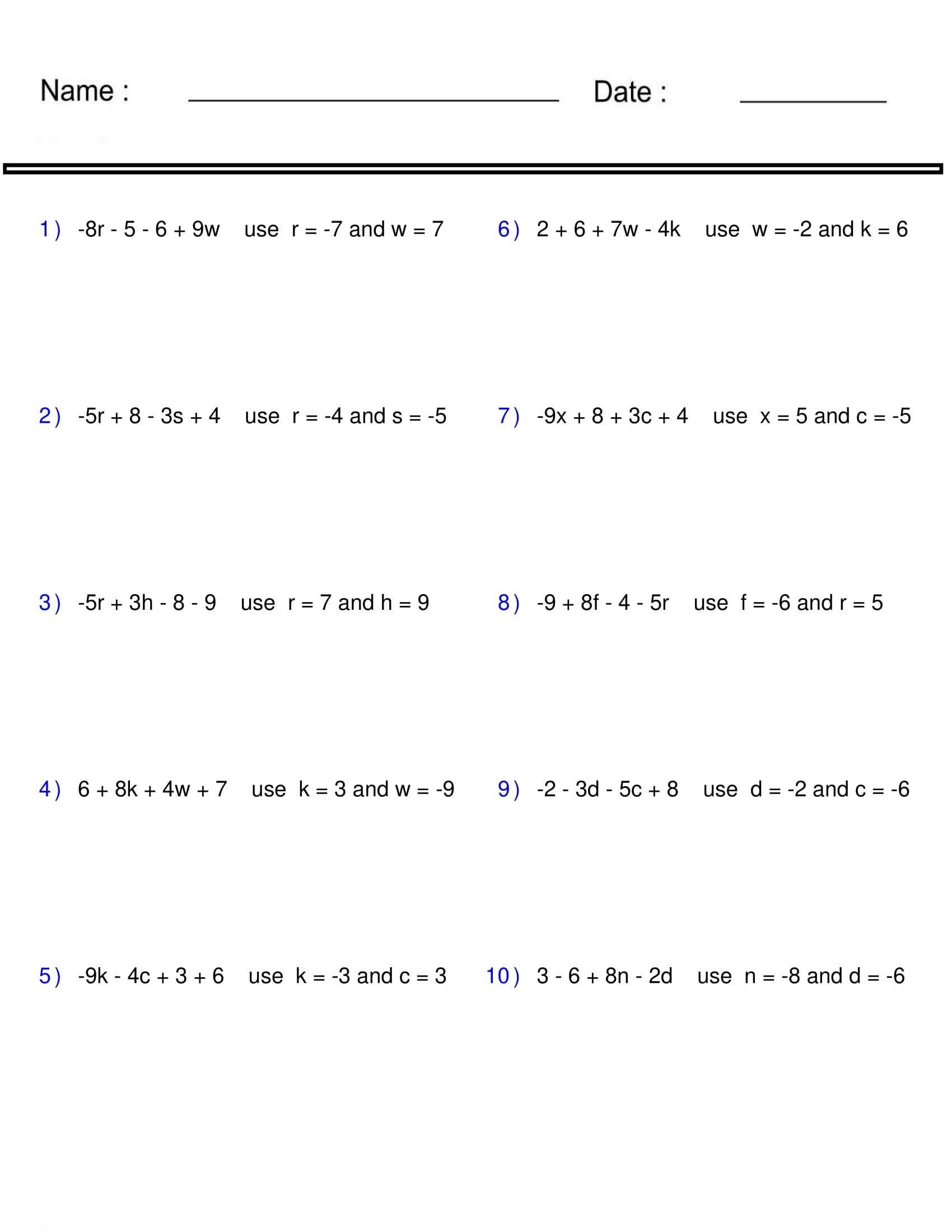 Free Worksheets For Evaluating Expressions With Variables Grades 6 8 Pre algebra And Algebra 1