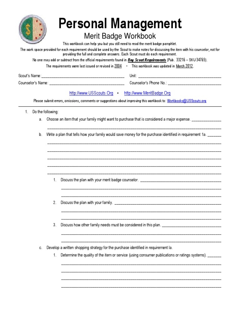 Personal Management BSA Merit Badge Worksheets PDF Boy Scouts Worksheets Library