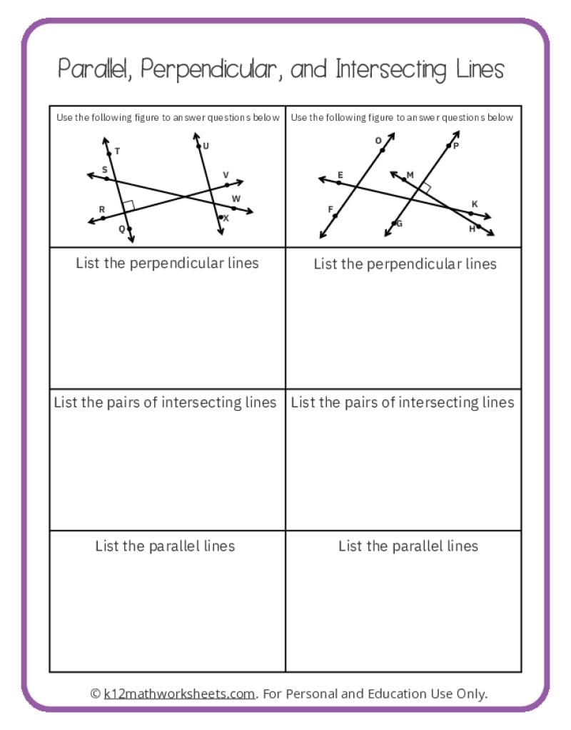 These worksheets typically feature a variety of exercises, such as identifying parallel and perpendicular lines in shapes, determining angles formed by these lines, and solving real-world problems involving these concepts. By practicing with these worksheets, you’ll build confidence and proficiency in no time.