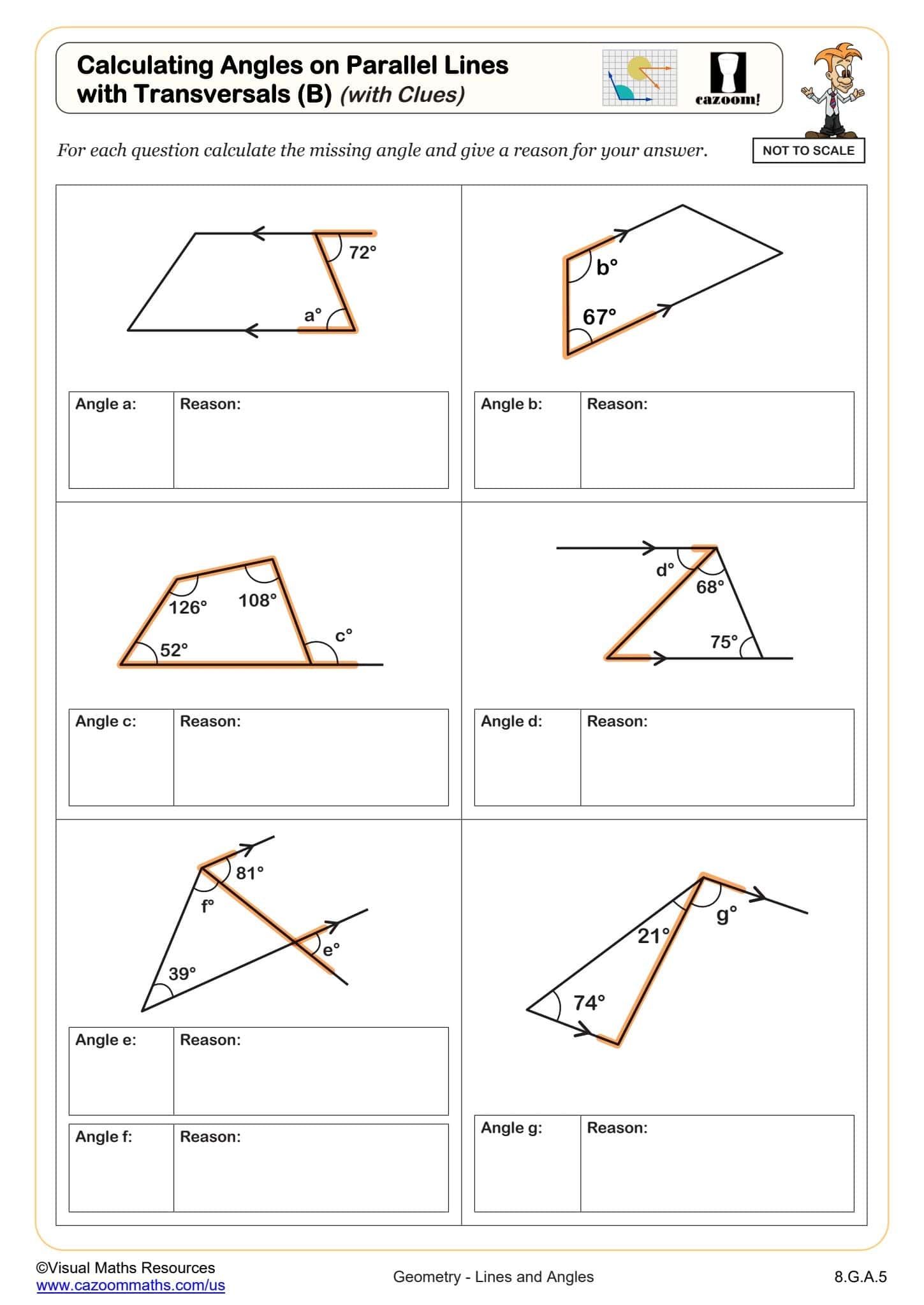 Calculating Angles On Parallel Lines With Transversals B with Clues Worksheet Fun And Engaging 8th Grade PDF Worksheets
