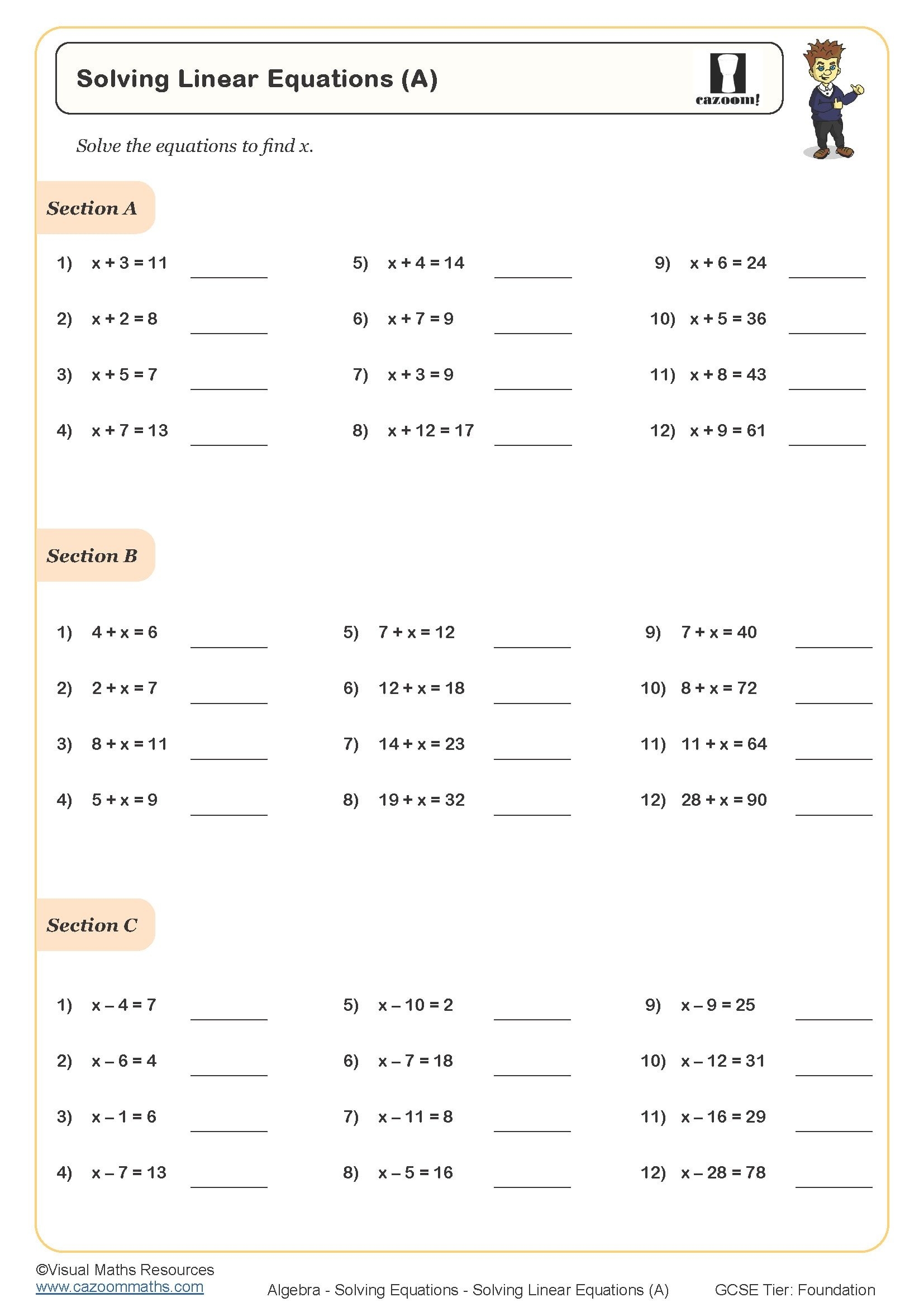 Solving Linear Equations A Worksheet Cazoom Maths Worksheets