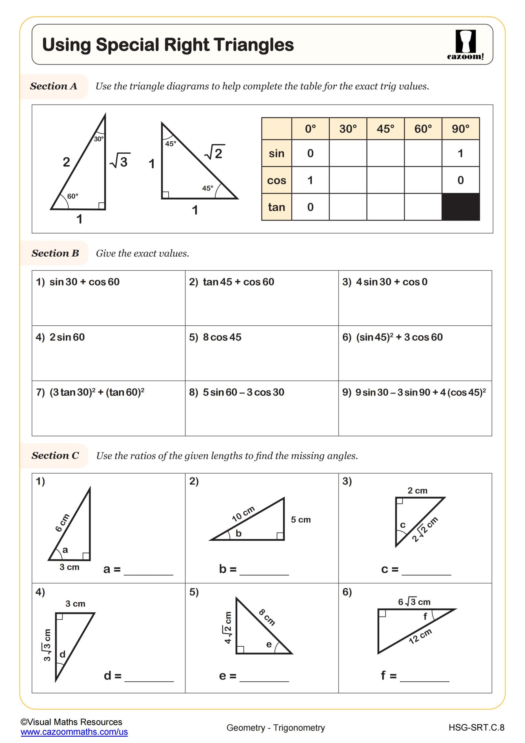 By working through the problems in this worksheet, you will gain a deeper understanding of special right triangles and build confidence in solving related problems. From identifying special triangles to applying trigonometric functions, each question is designed to challenge you and reinforce key concepts.